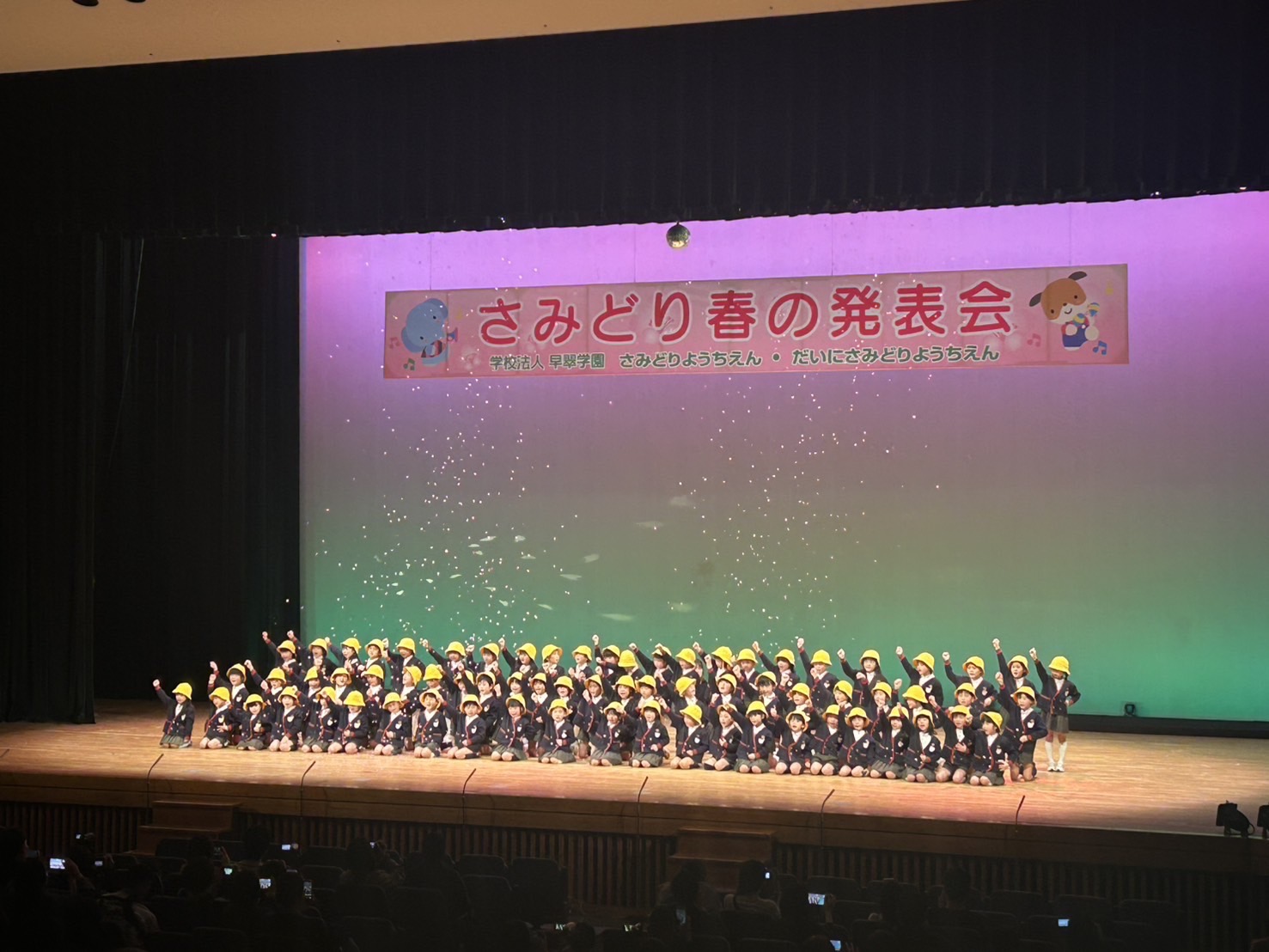 令和7年度 さみどり春の発表会 2026.02.21 さみどりレポート お友だちや先生と一緒にいろいろなことを経験してきたことが、ステージ上で花ひらく発表会歌、ダンス、ミュージカル、オペレッタ大きなステージで友だちと一緒に心を一つに、伸びやかに堂々と表現を楽しみましたステージ上での子どもたちの姿、凛といきいきとしていました。その姿に一人一人の大きな成長が感じられました。 保護者の方々の温かい拍手に包まれ、成長をみんなで喜びあえる節目の日となりました。本日は本当にありがとうございました!!